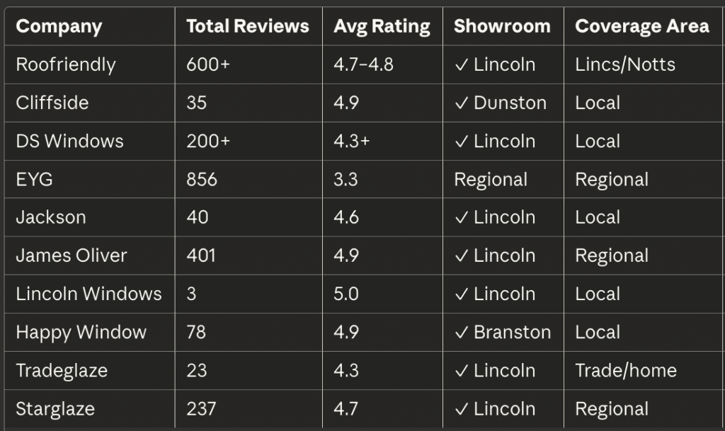 📊 Data Snapshot: Among Lincoln’s 10 most-established window companies, review volumes vary from 3 to 600+. Roofriendly (600+), James Oliver (401), and Starglaze (237) lead in verified customer feedback, while newer or trade-focused firms show smaller public footprints. For homeowners prioritising proven track record, prioritize companies with 100+ reviews across multiple platforms.